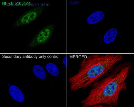 Immunocytochemistry analysis of HeLa cells labeling NF-kB p105 / p50 with Rabbit anti-NF-kB p105 / p50 antibody (R1309-9) at 1/100 dilution. Cells were fixed in 4% paraformaldehyde for 15 minutes at room temperature, permeabilized with 0.1% Triton X-100 in PBS for 15 minutes at room temperature, then blocked with 1% BSA in 10% negative goat serum for 1 hour at room temperature. Cells were then incubated with Rabbit anti-NF-kB p105 / p50 antibody (R1309-9) at 1/100 dilution in 1% BSA in PBST overnight at 4 ℃. Goat Anti-Rabbit IgG H&L (iFluor™ 488, HA1121) was used as the secondary antibody at 1/1,000 dilution. PBS instead of the primary antibody was used as the secondary antibody only control. Nuclear DNA was labelled in blue with DAPI. Beta tubulin (HA601187, red) was stained at 1/100 dilution overnight at +4℃. Goat Anti-Mouse IgG H&L (iFluor™ 594, HA1126) was used as the secondary antibody at 1/1,000 dilution.