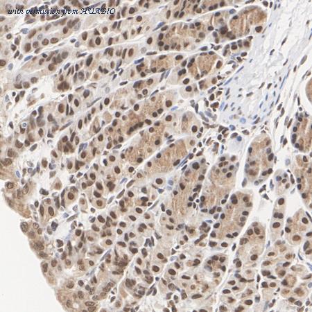 Immunohistochemical analysis of paraffin-embedded mouse stomach tissue with Rabbit anti-NF-kB p105 / p50 antibody (R1309-9) at 1/1,000 dilution. The section was pre-treated using heat mediated antigen retrieval with Tris-EDTA buffer (pH 9.0) for 20 minutes. The tissues were blocked in 1% BSA for 20 minutes at room temperature, washed with ddH2O and PBS, and then probed with the primary antibody (R1309-9) at 1/1,000 dilution for 1 hour at room temperature. The detection was performed using an HRP conjugated compact polymer system. DAB was used as the chromogen. Tissues were counterstained with hematoxylin and mounted with DPX.
