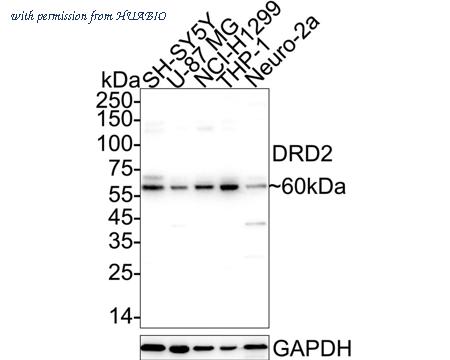 Western blot analysis of Dopamine D2 Receptor on different lysates with Rabbit anti-Dopamine D2 Receptor antibody (HA723162) at 1/10,000 dilution. Lane 1: SH-SY5Y cell lysate (no heat) Lane 2: U-87 MG cell lysate (no heat) Lane 3: NCI-H1299 cell lysate (no heat) Lane 4: THP-1 cell lysate (no heat) Lane 5: Neuro-2a cell lysate (no heat) Notice: no heat means the lysate is not boiled. Lysates/proteins at 20 µg/Lane. Predicted band size: 51 kDa Observed band size: 60 kDa Exposure time: 10 seconds; ECL: K1801; 4-20% SDS-PAGE gel. Proteins were transferred to a PVDF membrane and blocked with 5% NFDM/TBST for 1 hour at room temperature. The primary antibody (HA723162) at 1/10,000 dilution was used in 5% NFDM/TBST at 4℃ overnight. Goat Anti-Rabbit IgG - HRP Secondary Antibody (HA1001) at 1/50,000 dilution was used for 1 hour at room temperature.