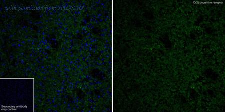 Immunofluorescence analysis of frozen mouse striatum tissue with Rabbit anti-Dopamine D2 Receptor antibody (HA723162) at 1/500 dilution. The section was not undergone antigen retrieval. The tissues were blocked in 10% negative goat serum for 1 hour at room temperature, washed with PBS, and then probed with the primary antibody (HA723162, green) at 1/500 dilution overnight at 4 ℃, washed with PBS. Goat Anti-Rabbit IgG H&L (iFluor™ 488, HA1121) was used as the secondary antibody at 1/1,000 dilution. Nuclei were counterstained with DAPI (blue).