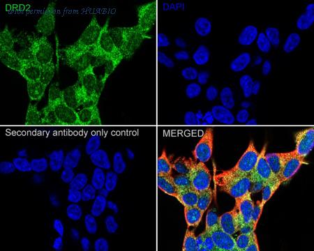 Immunocytochemistry analysis of SH-SY5Y cells labeling Dopamine D2 Receptor with Rabbit anti-Dopamine D2 Receptor antibody (HA751324) at 1/100 dilution. Cells were fixed in 4% paraformaldehyde for 15 minutes at room temperature, permeabilized with 0.1% Triton X-100 in PBS for 15 minutes at room temperature, then blocked with 1% BSA in 10% negative goat serum for 1 hour at room temperature. Cells were then incubated with Rabbit anti-Dopamine D2 Receptor antibody (HA751324) at 1/100 dilution in 1% BSA in PBST overnight at 4 ℃. Goat Anti-Rabbit IgG H&L (iFluor™ 488, HA1121) was used as the secondary antibody at 1/1,000 dilution. PBS instead of the primary antibody was used as the secondary antibody only control. Nuclear DNA was labelled in blue with DAPI. Beta tubulin (HA601187, red) was stained at 1/100 dilution overnight at +4℃. Goat Anti-Mouse IgG H&L (iFluor™ 594, HA1126) was used as the secondary antibody at 1/1,000 dilution.