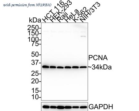 Western blot analysis of PCNA on different lysates with Mouse anti-PCNA antibody (HA610056) at 1/20,000 dilution. Lane 1: HCT 116 cell lysate (20 µg/Lane) Lane 2: HEK-293 cell lysate (20 µg/Lane) Lane 3: Raji cell lysate (20 µg/Lane) Lane 4: HeLa cell lysate (20 µg/Lane) Lane 5: K-562 cell lysate (20 µg/Lane) Lane 6: NIH/3T3 cell lysate (20 µg/Lane) Predicted band size: 29 kDa Observed band size: 34 kDa Exposure time: 1 minutes 2 seconds; ECL: K1801; 4-20% SDS-PAGE gel. Proteins were transferred to a PVDF membrane and blocked with 5% NFDM/TBST for 1 hour at room temperature. The primary antibody (HA610056) at 1/20,000 dilution was used in 5% NFDM/TBST at 4℃ overnight. Goat Anti-Mouse IgG - HRP Secondary Antibody (HA1006) at 1/100,000 dilution was used for 1 hour at room temperature.