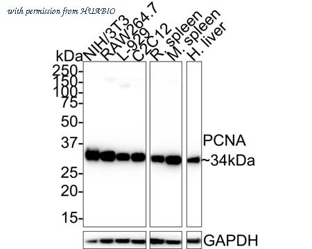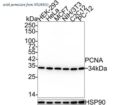 Western blot analysis of PCNA on different lysates with Rabbit anti-PCNA antibody (HA750084) at 1/5,000 dilution. Lane 1: HEK-293 cell lysate Lane 2: HeLa cell lysate Lane 3: MCF7 cell lysate Lane 4: NIH/3T3 cell lysate Lane 5: C2C12 cell lysate Lane 6: PC-12 cell lysate Lysates/proteins at 15 µg/Lane. Predicted band size: 29 kDa Observed band size: 34 kDa Exposure time: 24 seconds; 4-20% SDS-PAGE gel. Proteins were transferred to a PVDF membrane and blocked with 5% NFDM/TBST for 1 hour at room temperature. The primary antibody (HA750084) at 1/5,000 dilution was used in 5% NFDM/TBST at 4℃ overnight. Goat Anti-Rabbit IgG - HRP Secondary Antibody (HA1001) at 1/100,000 dilution was used for 1 hour at room temperature.