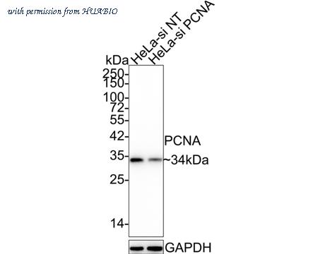 Western blot analysis of PCNA on different lysates with Mouse anti-PCNA antibody (EM111201) at 1/5,000 dilution. Lane 1: HeLa-si NT cell lysate Lane 2: HeLa-si PCNA cell lysate Lysates/proteins at 10 µg/Lane. Predicted band size: 29 kDa Observed band size: 34 kDa Exposure time: 24 seconds; 4-20% SDS-PAGE gel. Proteins were transferred to a PVDF membrane and blocked with 5% NFDM/TBST for 1 hour at room temperature. The primary antibody (EM111201) at 1/5,000 dilution was used in 5% NFDM/TBST at 4℃ overnight. Goat Anti-Mouse IgG - HRP Secondary Antibody (HA1006) at 1/50,000 dilution was used for 1 hour at room temperature.