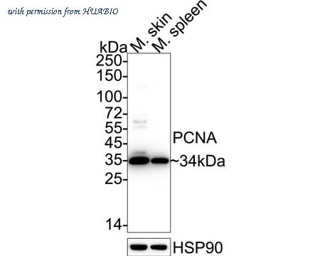 Western blot analysis of PCNA on different lysates with Rabbit anti-PCNA antibody (HA750084) at 1/1,000 dilution. Lane 1: Mouse skin tissue lysate Lane 2: Mouse spleen tissue lysate Lysates/proteins at 40 µg/Lane. Predicted band size: 29 kDa Observed band size: 34 kDa Exposure time: 10 seconds; ECL: K1801; 4-20% SDS-PAGE gel. Proteins were transferred to a PVDF membrane and blocked with 5% NFDM/TBST for 1 hour at room temperature. The primary antibody (HA750084) at 1/1,000 dilution was used in 5% NFDM/TBST at 4℃ overnight. Goat Anti-Rabbit IgG - HRP Secondary Antibody (HA1001) at 1/50,000 dilution was used for 1 hour at room temperature.