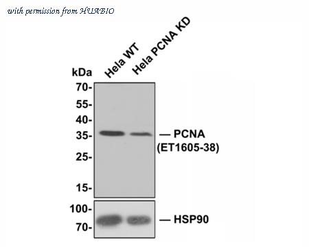 Western blot analysis of PCNA with anti-PCNA antibody (ET1605-38) at 1/5,000 dilution. Lane 1: Wild-type Hela whole cell lysate (10 µg). Lane 2: PCNA knockdown Hela whole cell lysate (10 µg). Predicted band size: 29 kDa Observed band size: 35 kDa Proteins were transferred to a PVDF membrane and blocked with 5% NFDM in TBST for 1 hour at room temperature. The primary antibody (ET1605-38, 1/5,000) was used in 5% BSA at room temperature for 2 hours. Goat Anti-Rabbit IgG-HRP Secondary Antibody (HA1001) at 1/50,000 dilution was used for 1 hour at room temperature.
