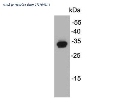 Western blot analysis of PCNA with anti-PCNA antibody (HA750084) at 1/5,000 dilution. Lane 1: Wild-type Hela whole cell lysate (10 µg). Lane 2: PCNA knockdown Hela whole cell lysate (10 µg). Predicted band size: 29 kDa Observed band size: 35 kDa Proteins were transferred to a PVDF membrane and blocked with 5% NFDM in TBST for 1 hour at room temperature. The primary antibody (ET1605-38, 1/5,000) was used in 5% BSA at room temperature for 2 hours. Goat Anti-Rabbit IgG-HRP Secondary Antibody (HA1001) at 1/50,000 dilution was used for 1 hour at room temperature.
