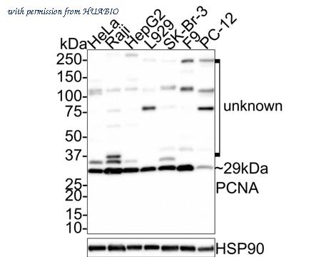 Western blot analysis of PCNA on different lysates with Rabbit anti-PCNA antibody (R1306-5) at 1/1,000 dilution. Lane 1: HeLa cell lysate Lane 2: Raji cell lysate Lane 3: HepG2 cell lysate Lane 4: L929 cell lysate Lane 5: SK-Br-3 cell lysate Lane 6: F9 cell lysate Lane 7: PC-12 cell lysate Lysates/proteins at 20 µg/Lane. Predicted band size: 29 kDa Observed band size: 29 kDa Exposure time: 2 minutes; 4-20% SDS-PAGE gel. Proteins were transferred to a PVDF membrane and blocked with 5% NFDM/TBST for 1 hour at room temperature. The primary antibody (R1306-5) at 1/1,000 dilution was used in 5% NFDM/TBST at room temperature for 2 hours. Goat Anti-Rabbit IgG - HRP Secondary Antibody (HA1001) at 1:100,000 dilution was used for 1 hour at room temperature.
