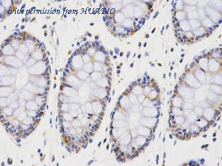 Immunohistochemical analysis of paraffin-embedded human colon tissue using anti-PCNA rabbit polyclonal antibody.