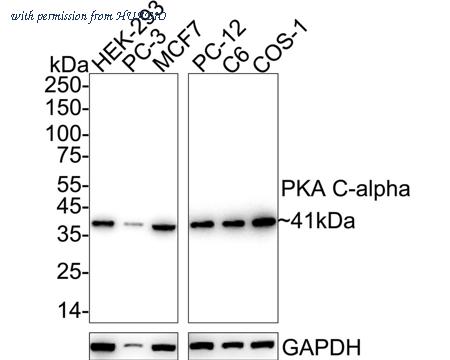 Western blot analysis of PKA C-alpha on different lysates with Rabbit anti-PKA C-alpha antibody (HA751232) at 1/2,000 dilution. Lane 1: HEK-293 cell lysate Lane 2: PC-3 cell lysate Lane 3: MCF7 cell lysate Lane 4: PC-12 cell lysate Lane 5: C6 cell lysate Lane 6: COS-1 cell lysate Lysates/proteins at 15 µg/Lane. Predicted band size: 41 kDa Observed band size: 41 kDa Exposure time: 20 seconds; ECL: K1801; 4-20% SDS-PAGE gel. Proteins were transferred to a PVDF membrane and blocked with 5% NFDM/TBST for 1 hour at room temperature. The primary antibody (HA751232) at 1/2,000 dilution was used in 5% NFDM/TBST at 4℃ overnight. Goat Anti-Rabbit IgG - HRP Secondary Antibody (HA1001) at 1/50,000 dilution was used for 1 hour at room temperature.