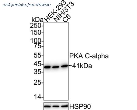 Western blot analysis of PKA C-alpha on different lysates with Rabbit anti-PKA C-alpha antibody (HA723003) at 1/2,000 dilution. Lane 1: HEK-293 cell lysate Lane 2: NIH/3T3 cell lysate Lane 3: C6 cell lysate Lysates/proteins at 20 µg/Lane. Predicted band size: 41 kDa Observed band size: 41 kDa Exposure time: 10 seconds; ECL: K1801; 4-20% SDS-PAGE gel. Proteins were transferred to a PVDF membrane and blocked with 5% NFDM/TBST for 1 hour at room temperature. The primary antibody (HA723003) at 1/2,000 dilution was used in 5% NFDM/TBST at 4℃ overnight. Goat Anti-Rabbit IgG - HRP Secondary Antibody (HA1001) at 1/50,000 dilution was used for 1 hour at room temperature.