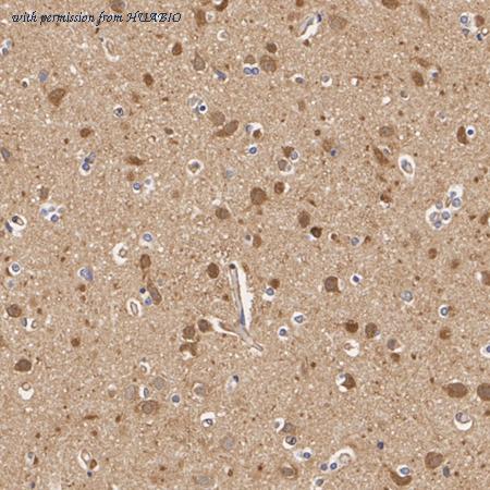Immunohistochemical analysis of paraffin-embedded human brain tissue with Rabbit anti-PKA C-alpha antibody (HA723003) at 1/1,000 dilution. The section was pre-treated using heat mediated antigen retrieval with Tris-EDTA buffer (pH 9.0) for 20 minutes. The tissues were blocked in 1% BSA for 20 minutes at room temperature, washed with ddH2O and PBS, and then probed with the primary antibody (HA723003) at 1/1,000 dilution for 1 hour at room temperature. The detection was performed using an HRP conjugated compact polymer system. DAB was used as the chromogen. Tissues were counterstained with hematoxylin and mounted with DPX.