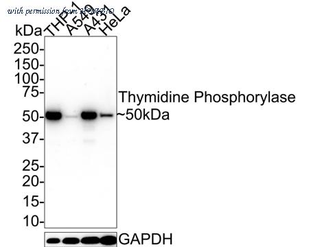 Western blot analysis of Thymidine Phosphorylase on different lysates with Mouse anti-Thymidine Phosphorylase antibody (EM1901-22) at 1/1,000 dilution. Lane 1: THP-1 cell lysate Lane 2: A549 cell lysate Lane 3: A431 cell lysate Lane 4: HeLa cell lysate Lysates/proteins at 20 µg/Lane. Predicted band size: 50 kDa Observed band size: 50 kDa Exposure time: 25 seconds; 4-20% SDS-PAGE gel. Proteins were transferred to a PVDF membrane and blocked with 5% NFDM/TBST for 1 hour at room temperature. The primary antibody (EM1901-22) at 1/1,000 dilution was used in 5% NFDM/TBST at 4℃ overnight. Goat Anti-Mouse IgG - HRP Secondary Antibody (HA1006) at 1/50,000 dilution was used for 1 hour at room temperature.