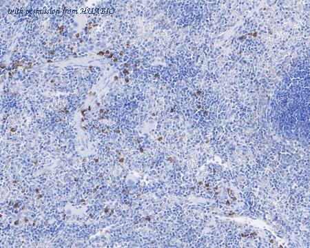 Immunohistochemical analysis of paraffin-embedded rat spleen tissue with Mouse anti-Thymidine Phosphorylase antibody (HA610106) at 1/3,000 dilution. The section was pre-treated using heat mediated antigen retrieval with Tris-EDTA buffer (pH 9.0) for 20 minutes. The tissues were blocked in 1% BSA for 20 minutes at room temperature, washed with ddH2O and PBS, and then probed with the primary antibody (HA610106) at 1/3,000 dilution for 1 hour at room temperature. The detection was performed using an HRP conjugated compact polymer system. DAB was used as the chromogen. Tissues were counterstained with hematoxylin and mounted with DPX.