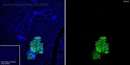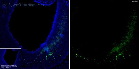 Immunofluorescence analysis of frozen mouse embryonic brain tissue with Rabbit anti-BRN3A antibody (HA751421) at 1/500 dilution. The section was pre-treated using heat mediated antigen retrieval with sodium citrate buffer (pH 6.0) for about 2 minutes in microwave oven. The tissues were blocked in 10% negative goat serum for 1 hour at room temperature, washed with PBS, and then probed with the primary antibody (HA751421, green) at 1/500 dilution overnight at 4 ℃, washed with PBS. Goat Anti-Rabbit IgG H&L (iFluor™ 488, HA1121) was used as the secondary antibody at 1/1,000 dilution. Nuclei were counterstained with DAPI (blue).