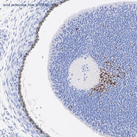 Immunohistochemical analysis of paraffin-embedded mouse embryonic eye tissue with Rat anti-BRN3A antibody (HA601412) at 1/50 dilution. The section was pre-treated using heat mediated antigen retrieval with sodium citrate buffer (pH 6.0) (high pressure) for 2 minutes. The tissues were blocked in 1% BSA for 20 minutes at room temperature, washed with ddH2O and PBS, and then probed with the primary antibody (HA601412) at 1/50 dilution for 1 hour at room temperature. The detection was performed using an HRP conjugated compact polymer system. DAB was used as the chromogen. Tissues were counterstained with hematoxylin and mounted with DPX.