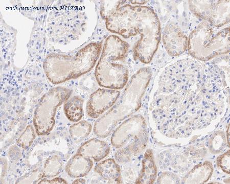 Immunohistochemical analysis of paraffin-embedded human kidney tissue with Rabbit anti-EGF antibody (ET1704-33) at 1/200 dilution. The section was pre-treated using heat mediated antigen retrieval with Tris-EDTA buffer (pH 9.0) for 20 minutes. The tissues were blocked in 1% BSA for 20 minutes at room temperature, washed with ddH2O and PBS, and then probed with the primary antibody (ET1704-33) at 1/200 dilution for 1 hour at room temperature. The detection was performed using an HRP conjugated compact polymer system. DAB was used as the chromogen. Tissues were counterstained with hematoxylin and mounted with DPX.