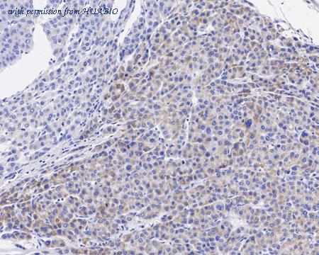 Immunohistochemical analysis of paraffin-embedded human liver cancer tissue with Rabbit anti-EGF antibody (ET1704-33) at 1/200 dilution. The section was pre-treated using heat mediated antigen retrieval with Tris-EDTA buffer (pH 9.0) for 20 minutes. The tissues were blocked in 1% BSA for 20 minutes at room temperature, washed with ddH2O and PBS, and then probed with the primary antibody (ET1704-33) at 1/200 dilution for 1 hour at room temperature. The detection was performed using an HRP conjugated compact polymer system. DAB was used as the chromogen. Tissues were counterstained with hematoxylin and mounted with DPX.