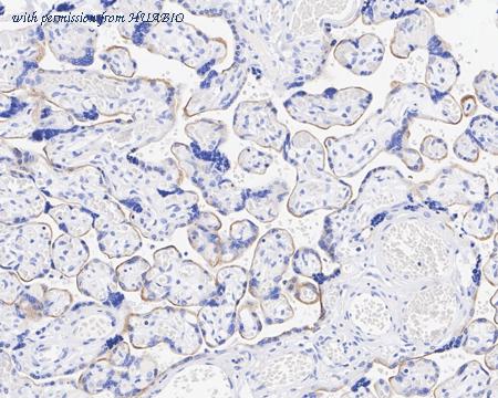 Immunohistochemical analysis of paraffin-embedded human placenta tissue with Rabbit anti-EGF antibody (ET1704-33) at 1/1,000 dilution. The section was pre-treated using heat mediated antigen retrieval with Tris-EDTA buffer (pH 9.0) for 20 minutes. The tissues were blocked in 1% BSA for 20 minutes at room temperature, washed with ddH2O and PBS, and then probed with the primary antibody (ET1704-33) at 1/1,000 dilution for 1 hour at room temperature. The detection was performed using an HRP conjugated compact polymer system. DAB was used as the chromogen. Tissues were counterstained with hematoxylin and mounted with DPX.