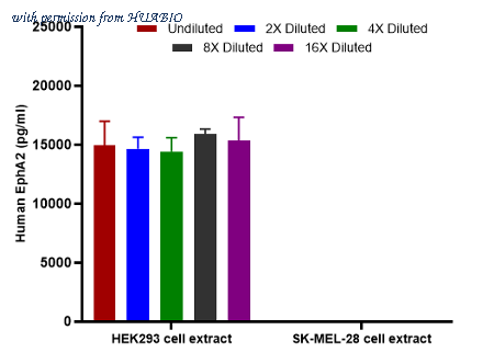 Interpolated concentrations of native EphA2 in HEK293 and SK-MEL-28 extract samples based on a 1,000 µg/ml extract load. Capture: HA723714, Human EphA2 Rabbit mAb [PSH15-12] Detector: HA723715, Human EphA2 Rabbit mAb [PSH15-13] The concentrations of EphA2 were measured in duplicates, interpolated from the EphA2 standard curve and corrected for sample dilution. Undiluted samples are HEK293 extract 40% and SK-MEL-28 extract 50%. The interpolated dilution factor corrected values are plotted (mean +/- SD, n=2). The mean EphA2 concentration was determined to be 15,046 pg/ml in HEK293 extract and undetectable in SK-MEL-28 extract.