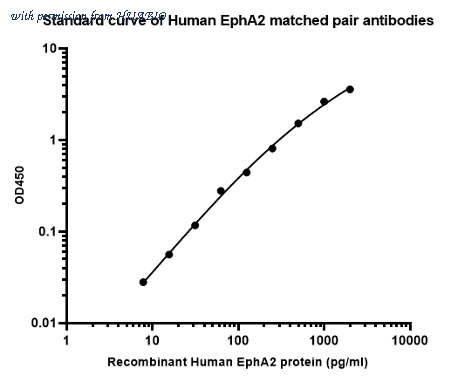 Sandwich ELISA analysis of Human EphA2 matched pair antibodies Capture: HA723714, Human EphA2 Rabbit mAb [PSH15-12] Detector: HA723715, Human EphA2 Rabbit mAb [PSH15-13] Elisa assay was performed by coating wells of a 96-well plate with 100 µl per well of capture antibody (HA723714) diluted in carbonate/bicarbonate buffer, at a concentration of 5 µg/ml overnight at 4℃. Wells of the plate were washed, blocked with 150 µl 0.05% tween-20 1% BSA blocking buffer, and incubated with serial diluted Recombinant Human EphA2 protein (HA211075) starting from 2,000 pg/ml to 0 pg/ml and detect antibody (HA723715, Biotin, 0.2 µg/ml) for 1 hour at 30℃ with shaking. Then the plate was washed and incubated with 100 µl per well of SA-HRP for 0.5 hour at 30℃ with shaking. Detection was performed using an Ultra TMB Substrate for 10 minutes at room temperature in the dark. The reaction was stopped with sulfuric acid and absorbances were read on a spectrophotometer at 450 nm.