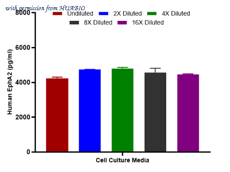 Interpolated concentrations of spiked EphA2 in human cell culture media samples. Capture: HA723714, Human EphA2 Rabbit mAb [PSH15-12] Detector: HA723715, Human EphA2 Rabbit mAb [PSH15-13] The concentrations of EphA2 were measured in duplicates, interpolated from the EphA2 standard curves and corrected for sample dilution. Undiluted samples are as follows: cell culture media 50%. The interpolated dilution factor corrected values are plotted (mean +/- SD, n=2).