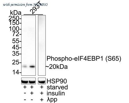 Western blot analysis of Phospho-eIF4EBP1 (S65) on different lysates with Rabbit anti-Phospho-eIF4EBP1 (S65) antibody (HA751291) at 1/1,000 dilution. Lane 1: 293T starved for 24 hours cell lysate Lane 2: 293T starved for 24 hours then treated with 100nM insulin for 30 minutes cell lysate Lane 3: 293T starved for 24 hours then treated with 100nM insulin for 30 minutes cell lysate, then the membrane treated with λpp for 1 hour Lysates/proteins at 20 µg/Lane. Predicted band size: 13 kDa Observed band size: 20 kDa Exposure time: 3 minutes; ECL: K1802; 4-20% SDS-PAGE gel. Proteins were transferred to a PVDF membrane and blocked with 5% NFDM/TBST for 1 hour at room temperature. The primary antibody (HA751291) at 1/1,000 dilution was used in primary antibody dilution (WB500D) at 4℃ overnight. Goat Anti-Rabbit IgG - HRP Secondary Antibody (HA1001) at 1/50,000 dilution was used for 1 hour at room temperature.