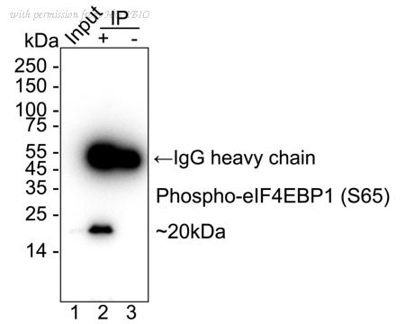 Phospho-eIF4EBP1 (S65) was immunoprecipitated from 0.2 mg 293T cell lysate with HA723106 at 2 µg/10 µl beads. Western blot was performed from the immunoprecipitate using HA723106 at 1/1,000 dilution. Alpaca anti-Rabbit IgG Fc secondary antibody (HA1031) at 1/50,000 dilution was used for 1 hour at room temperature. Lane 1: 293T cell lysate (input) Lane 2: HA723106 IP in 293T cell lysate Lane 3: Rabbit IgG instead of HA723106 in 293T cell lysate Blocking/Dilution buffer: 5% NFDM/TBST Exposure time: 18 seconds; ECL: K1801