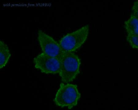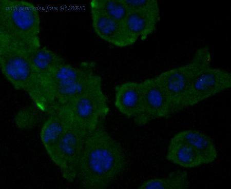 ICC staining Alpha-2-macroglobulin in H22 cells (green). Formalin fixed cells were permeabilized with 0.1% Triton X-100 in TBS for 10 minutes at room temperature and blocked with 1% Blocker BSA for 15 minutes at room temperature. Cells were probed with Alpha-2-macroglobulin monoclonal antibody at a dilution of 1:50 for at least 1 hour at room temperature, washed with PBS. Alexa Fluorc™ 488 Goat anti-Mouse IgG was used as the secondary antibody at 1/100 dilution. The nuclear counter stain is DAPI (blue).