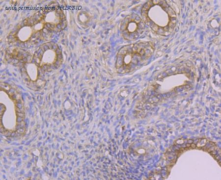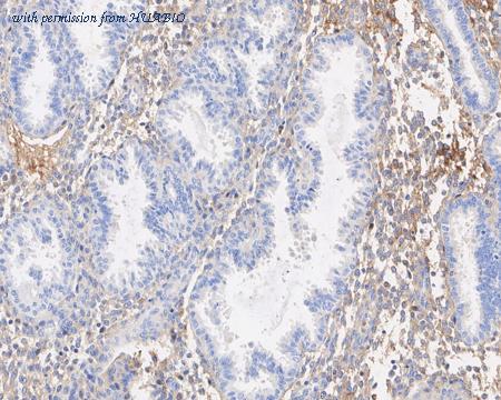 Immunohistochemical analysis of paraffin-embedded human endometrium tissue with Mouse anti-Alpha-2-macroglobulin antibody (M1510-24) at 1/2,000 dilution. The section was pre-treated using heat mediated antigen retrieval with Tris-EDTA buffer (pH 9.0) for 20 minutes. The tissues were blocked in 1% BSA for 20 minutes at room temperature, washed with ddH2O and PBS, and then probed with the primary antibody (M1510-24) at 1/2,000 dilution for 1 hour at room temperature. The detection was performed using an HRP conjugated compact polymer system. DAB was used as the chromogen. Tissues were counterstained with hematoxylin and mounted with DPX.