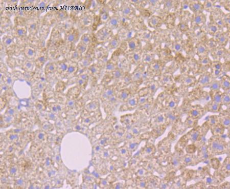 Immunohistochemical analysis of paraffin-embedded human liver tissue with Rabbit anti-A2M antibody (ET1703-69) at 1/200 dilution. The section was pre-treated using heat mediated antigen retrieval with Tris-EDTA buffer (pH 9.0) for 20 minutes. The tissues were blocked in 1% BSA for 20 minutes at room temperature, washed with ddH2O and PBS, and then probed with the primary antibody (ET1703-69) at 1/200 dilution for 1 hour at room temperature. The detection was performed using an HRP conjugated compact polymer system. DAB was used as the chromogen. Tissues were counterstained with hematoxylin and mounted with DPX.