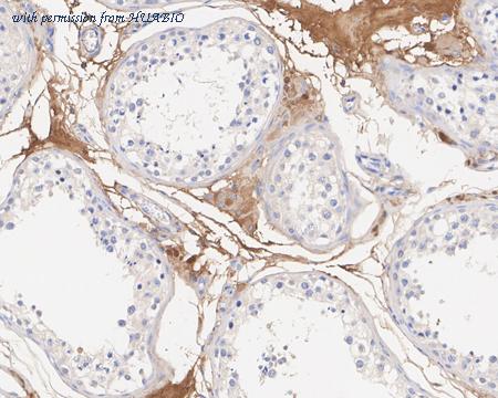 Immunohistochemical analysis of paraffin-embedded human testis tissue with Mouse anti-Alpha-2-macroglobulin antibody (M1510-24) at 1/2,000 dilution. The section was pre-treated using heat mediated antigen retrieval with Tris-EDTA buffer (pH 9.0) for 20 minutes. The tissues were blocked in 1% BSA for 20 minutes at room temperature, washed with ddH2O and PBS, and then probed with the primary antibody (M1510-24) at 1/2,000 dilution for 1 hour at room temperature. The detection was performed using an HRP conjugated compact polymer system. DAB was used as the chromogen. Tissues were counterstained with hematoxylin and mounted with DPX.