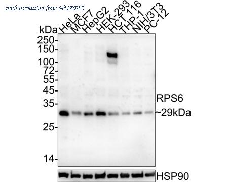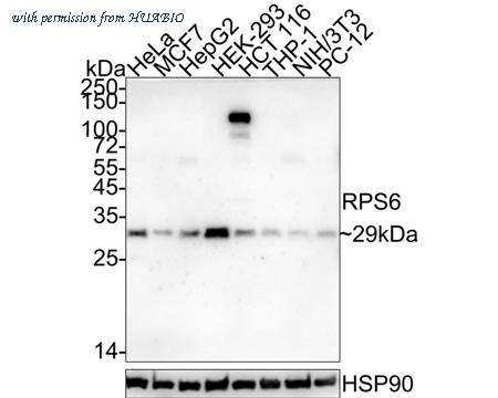 Western blot analysis of RPS6 on different lysates with Mouse anti-RPS6 antibody (HA601214) at 1/1,000 dilution. Lane 1: HeLa cell lysate (20 µg/Lane) Lane 2: MCF7 cell lysate (20 µg/Lane) Lane 3: HepG2 cell lysate (20 µg/Lane) Lane 4: HEK-293 cell lysate (20 µg/Lane) Lane 5: HCT 116 cell lysate (20 µg/Lane) Lane 6: THP-1 cell lysate (20 µg/Lane) Lane 7: NIH/3T3 cell lysate (20 µg/Lane) Lane 8: PC-12 cell lysate (20 µg/Lane) Lane 9: Human kidney tissue lysate (40 µg/Lane) Lane 10: Mouse spleen tissue lysate (40 µg/Lane) Predicted band size: 29 kDa Observed band size: 33 kDa Exposure time: 3 minutes; 4-20% SDS-PAGE gel. Proteins were transferred to a PVDF membrane and blocked with 5% NFDM/TBST for 1 hour at room temperature. The primary antibody (HA601214) at 1/1,000 dilution was used in 5% NFDM/TBST at 4℃ overnight. Goat Anti-Mouse IgG - HRP Secondary Antibody (HA1006) at 1/50,000 dilution was used for 1 hour at room temperature.