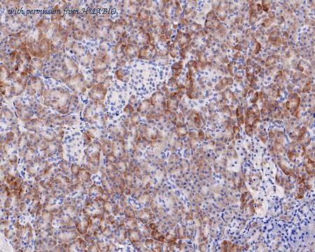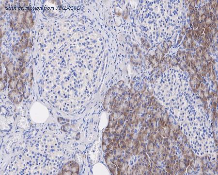 Immunohistochemical analysis of paraffin-embedded human pancreas tissue with Mouse anti-RPS6 antibody (HA600081) at 1/1,000 dilution. The section was pre-treated using heat mediated antigen retrieval with Tris-EDTA buffer (pH 9.0) for 20 minutes. The tissues were blocked in 1% BSA for 20 minutes at room temperature, washed with ddH2O and PBS, and then probed with the primary antibody (HA600081) at 1/1,000 dilution for 1 hour at room temperature. The detection was performed using an HRP conjugated compact polymer system. DAB was used as the chromogen. Tissues were counterstained with hematoxylin and mounted with DPX.