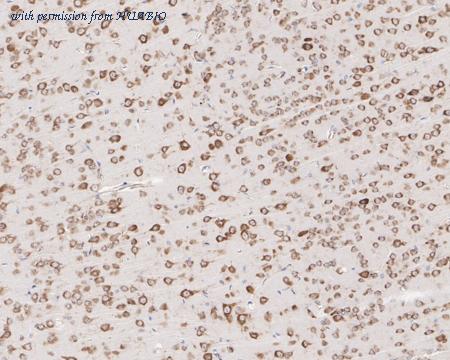 Immunohistochemical analysis of paraffin-embedded mouse cerebral cortex tissue with Mouse anti-RPS6 antibody (HA600081) at 1/1,000 dilution. The section was pre-treated using heat mediated antigen retrieval with Tris-EDTA buffer (pH 9.0) for 20 minutes. The tissues were blocked in 1% BSA for 20 minutes at room temperature, washed with ddH2O and PBS, and then probed with the primary antibody (HA600081) at 1/1,000 dilution for 1 hour at room temperature. The detection was performed using an HRP conjugated compact polymer system. DAB was used as the chromogen. Tissues were counterstained with hematoxylin and mounted with DPX.