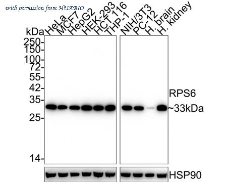 Western blot analysis of RPS6 on different lysates with Mouse anti-RPS6 antibody (HA600084) at 1/1,000 dilution. Lane 1: HeLa cell lysate (20 µg/Lane) Lane 2: MCF7 cell lysate (20 µg/Lane) Lane 3: HepG2 cell lysate (20 µg/Lane) Lane 4: HEK-293 cell lysate (20 µg/Lane) Lane 5: HCT 116 cell lysate (20 µg/Lane) Lane 6: THP-1 cell lysate (20 µg/Lane) Lane 7: NIH/3T3 cell lysate (20 µg/Lane) Lane 8: PC-12 cell lysate (20 µg/Lane) Lane 9: Human brain tissue lysate (40 µg/Lane) Lane 10: Human kidney tissue lysate (40 µg/Lane) Predicted band size: 29 kDa Observed band size: 33 kDa Exposure time: 3 minutes; 4-20% SDS-PAGE gel. Proteins were transferred to a PVDF membrane and blocked with 5% NFDM/TBST for 1 hour at room temperature. The primary antibody (HA600084) at 1/1,000 dilution was used in 5% NFDM/TBST at 4℃ overnight. Goat Anti-Mouse IgG - HRP Secondary Antibody (HA1006) at 1/50,000 dilution was used for 1 hour at room temperature.