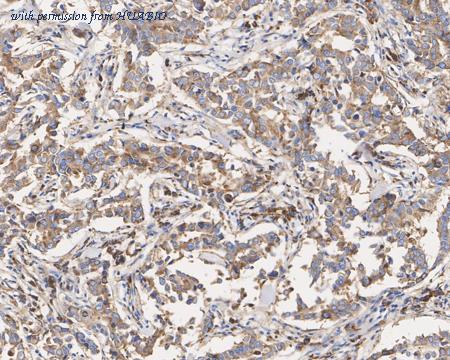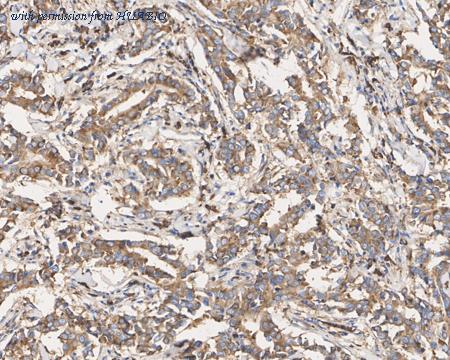 Immunohistochemical analysis of paraffin-embedded human breast carcinoma tissue with Mouse anti-RPS6 antibody (HA600084) at 1/2,000 dilution. The section was pre-treated using heat mediated antigen retrieval with sodium citrate buffer (pH 6.0) (high pressure) for 2 minutes. The tissues were blocked in 1% BSA for 20 minutes at room temperature, washed with ddH2O and PBS, and then probed with the primary antibody (HA600084) at 1/2,000 dilution for 1 hour at room temperature. The detection was performed using an HRP conjugated compact polymer system. DAB was used as the chromogen. Tissues were counterstained with hematoxylin and mounted with DPX.