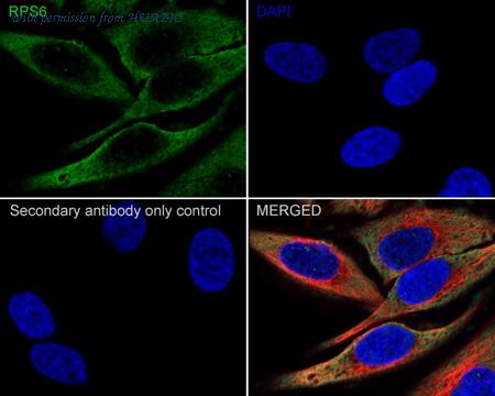 Immunocytochemistry analysis of HeLa cells labeling RPS6 with Mouse anti-RPS6 antibody (HA600084) at 1/200 dilution. Cells were fixed in 4% paraformaldehyde for 15 minutes, permeabilized with 0.1% Triton X-100 in PBS for 15 minutes, and then blocked with 1% BSA for 30 minutes at room temperature. Cells were then incubated with Mouse anti-RPS6 antibody (HA600084) at 1/200 dilution in 1% BSA overnight at 4 ℃. Goat Anti-Mouse IgG H&L (iFluor™ 488, HA1125) was used as the secondary antibody at 1/1,000 dilution. PBS instead of the primary antibody was used as the secondary antibody only control. Nuclear DNA was labelled in blue with DAPI.