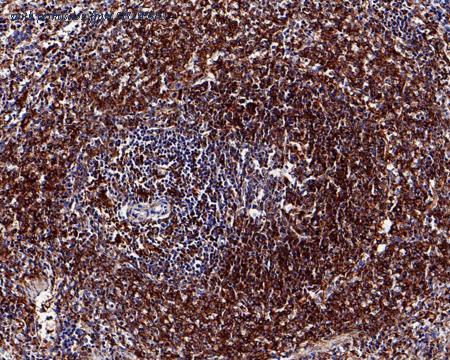 Immunohistochemical analysis of paraffin-embedded rat spleen tissue with Rabbit anti-Phospho-RPS6 (S235 + S236) antibody (HA750587) at 1/200 dilution. The section was pre-treated using heat mediated antigen retrieval with Tris-EDTA buffer (pH 9.0) for 20 minutes. The tissues were blocked in 1% BSA for 20 minutes at room temperature, washed with ddH2O and PBS, and then probed with the primary antibody (HA750587) at 1/200 dilution for 1 hour at room temperature. The detection was performed using an HRP conjugated compact polymer system. DAB was used as the chromogen. Tissues were counterstained with hematoxylin and mounted with DPX.