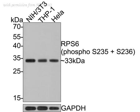 Western blot analysis of Phospho-RPS6 (S235 + S236) on different lysates with Rabbit anti-Phospho-RPS6 (S235 + S236) antibody (HA721275) at 1/1,000 dilution. Lane 1: NIH/3T3 cell lysate Lane 2: THP-1 cell lysate Lane 3: Hela cell lysate Lysates/proteins at 10 µg/Lane. Predicted band size: 29 kDa Observed band size: 33 kDa Exposure time: 30 seconds; 12% SDS-PAGE gel. Proteins were transferred to a PVDF membrane and blocked with 5% NFDM/TBST for 1 hour at room temperature. The primary antibody (HA721275) at 1/1,000 dilution was used in 5% NFDM/TBST at room temperature for 2 hours. Goat Anti-Rabbit IgG - HRP Secondary Antibody (HA1001) at 1:300,000 dilution was used for 1 hour at room temperature.