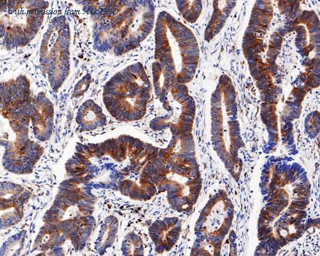 Immunohistochemical analysis of paraffin-embedded human colon carcinoma tissue with Rabbit anti-Phospho-RPS6 (S240 + S244) antibody (HA721589) at 1/5,000 dilution. The section was pre-treated using heat mediated antigen retrieval with sodium citrate buffer (pH 6.0) (high pressure) for 2 minutes. The tissues were blocked in 1% BSA for 20 minutes at room temperature, washed with ddH2O and PBS, and then probed with the primary antibody (HA721589) at 1/5,000 dilution for 1 hour at room temperature. The detection was performed using an HRP conjugated compact polymer system. DAB was used as the chromogen. Tissues were counterstained with hematoxylin and mounted with DPX.