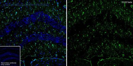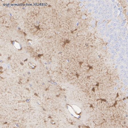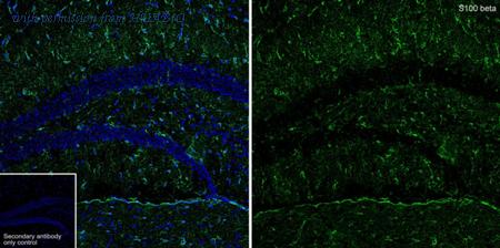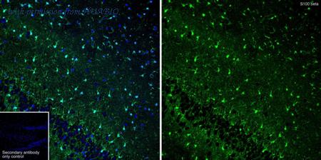 Immunohistochemical analysis of paraffin-embedded mouse hippocampus tissue with Rat anti-S100 beta antibody (HA610367) at 1/2,000 dilution. The section was pre-treated using heat mediated antigen retrieval with Tris-EDTA buffer (pH 9.0) for 20 minutes. The tissues were blocked in 1% BSA for 20 minutes at room temperature, washed with ddH2O and PBS, and then probed with the primary antibody (HA610367) at 1/2,000 dilution for 1 hour at room temperature. The detection was performed using an HRP conjugated compact polymer system. DAB was used as the chromogen. Tissues were counterstained with hematoxylin and mounted with DPX.