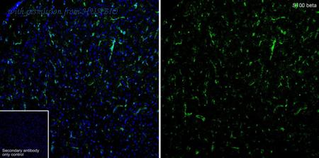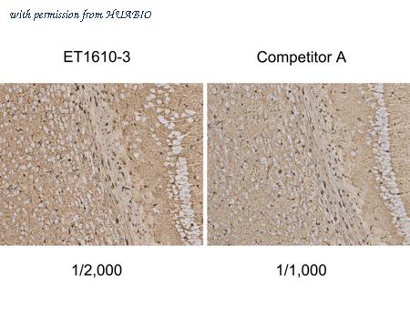 Immunohistochemical analysis of paraffin-embedded mouse brain tissue with Rabbit anti-S100 beta antibody (ET1610-3) at 1/2,000 dilution and competitor's antibody at 1/1,000 dilution. The section was pre-treated using heat mediated antigen retrieval with Tris-EDTA buffer (pH 9.0) for 20 minutes. The tissues were blocked in 1% BSA for 20 minutes at room temperature, washed with ddH2O and PBS, and then probed with the primary antibody (ET1610-3) at 1/2,000 dilution and competitor's antibody at 1/1,000 dilution for 1 hour at room temperature. The detection was performed using an HRP conjugated compact polymer system. DAB was used as the chromogen. Tissues were counterstained with hematoxylin and mounted with DPX.
