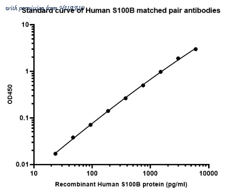 Sandwich ELISA analysis of Human S100B matched pair antibodies Capture: HA723728, Human S100B Rabbit mAb [SC57-02] Detector: HA723729, Human S100B Rabbit mAb [PSH15-25] Elisa assay was performed by coating wells of a 96-well plate with 100 µl per well of capture antibody (HA723728) diluted in carbonate/bicarbonate buffer, at a concentration of 5 µg/ml overnight at 4℃. Wells of the plate were washed, blocked with 150 µl 0.05% tween-20 1% BSA blocking buffer, and incubated with serial diluted S100B protein starting from 6,000 pg/ml to 0 pg/ml and detect antibody (HA723729, Biotin, 0.2 µg/ml) for 1 hour at 30℃ with shaking. Then the plate was washed and incubated with 100 µl per well of SA-HRP for 0.5 hour at 30℃ with shaking. Detection was performed using an Ultra TMB Substrate for 10 minutes at room temperature in the dark. The reaction was stopped with sulfuric acid and absorbances were read on a spectrophotometer at 450 nm.