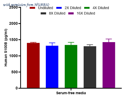 Interpolated concentrations of spiked S100B in serum-free media samples. Capture: HA723728, Human S100B Rabbit mAb [SC57-02] Detector: HA723729, Human S100B Rabbit mAb [PSH15-25] The concentrations of S100B were measured in duplicates, interpolated from the S100B standard curves and corrected for sample dilution. Undiluted samples are as follows: serum-free media 50%. The interpolated dilution factor corrected values are plotted (mean +/- SD, n=2).