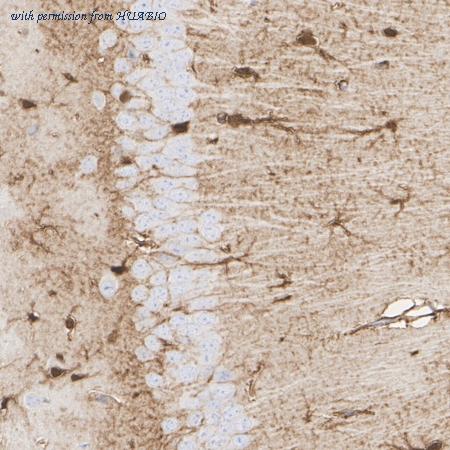 Immunohistochemical analysis of paraffin-embedded mouse hippocampus tissue with Rat anti-S100 beta antibody (HA601552) at 1/2,000 dilution. The section was pre-treated using heat mediated antigen retrieval with Tris-EDTA buffer (pH 9.0) for 20 minutes. The tissues were blocked in 1% BSA for 20 minutes at room temperature, washed with ddH2O and PBS, and then probed with the primary antibody (HA601552) at 1/2,000 dilution for 1 hour at room temperature. The detection was performed using an HRP conjugated compact polymer system. DAB was used as the chromogen. Tissues were counterstained with hematoxylin and mounted with DPX.