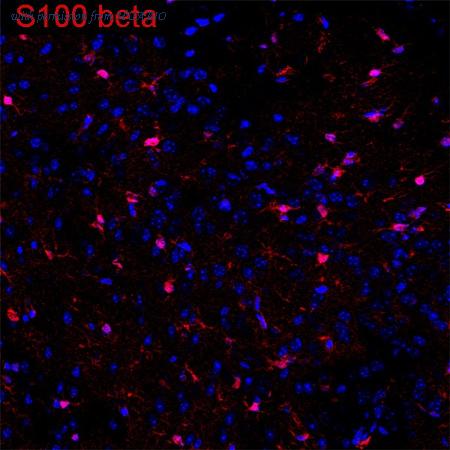 Immunofluorescence analysis of paraffin-embedded human meningioma tissue labeling S100 beta. The section was pre-treated using heat mediated antigen retrieval with Tris-EDTA buffer (pH 9.0) for 20 minutes. The tissues were blocked in 10% negative goat serum for 1 hour at room temperature, washed with PBS. The section was then incubated overnight at +4℃ with HA720125F S100 beta (iFluor™ 594, red) at 1/100 dilution, washed with PBS. DAPI was used as nuclear counterstain.