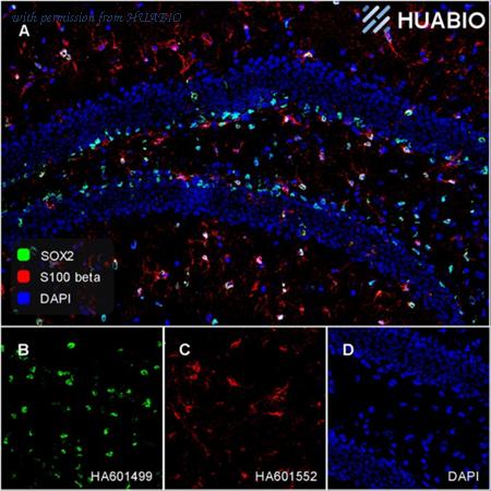 Application: IHC-Fr Species: Mouse Site: Cerebral cortex Sample: Frozen section Antibody concentration: 1/500 (S100 beta, HA610367, Rat, red); 1/200 (SOX2, HA601499, Chicken, green) Antigen retrieval: Not required