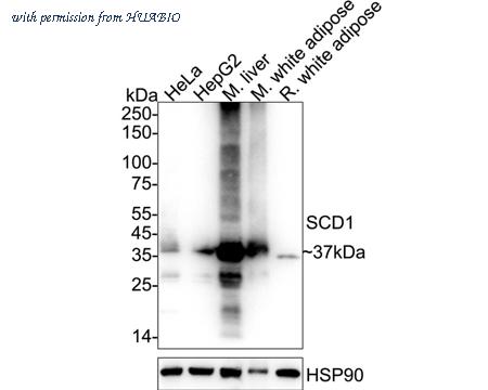 Western blot analysis of SCD1 on different lysates with Rabbit anti-SCD1 antibody (HA500119) at 1/5,000 dilution. Lane 1: HeLa cell lysate (20 µg/Lane) Lane 2: HepG2 cell lysate (20 µg/Lane) Lane 3: Mouse liver tissue lysate (40 µg/Lane) Lane 4: Mouse white adipose tissue lysate (40 µg/Lane) Lane 5: Rat white adipose tissue lysate (40 µg/Lane) Predicted band size: 42 kDa Observed band size: 37 kDa Exposure time: 10 seconds; ECL: K1801; 4-20% SDS-PAGE gel. Proteins were transferred to a PVDF membrane and blocked with 5% NFDM/TBST for 1 hour at room temperature. The primary antibody (HA500119) at 1/5,000 dilution was used in primary antibody dilution (K1803) at 4℃ overnight. Goat Anti-Rabbit IgG - HRP Secondary Antibody (HA1001) at 1/50,000 dilution was used for 1 hour at room temperature.