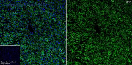 Immunohistochemical analysis of paraffin-embedded mouse adipose tissue with Rabbit anti-SCD1 antibody (HA751562) at 1/9,000 dilution. The section was pre-treated using heat mediated antigen retrieval with Tris-EDTA buffer (pH 9.0) for 20 minutes. The tissues were blocked in 1% BSA for 20 minutes at room temperature, washed with ddH2O and PBS, and then probed with the primary antibody (HA751562) at 1/9,000 dilution for 1 hour at room temperature. The detection was performed using an HRP conjugated compact polymer system. DAB was used as the chromogen. Tissues were counterstained with hematoxylin and mounted with DPX.